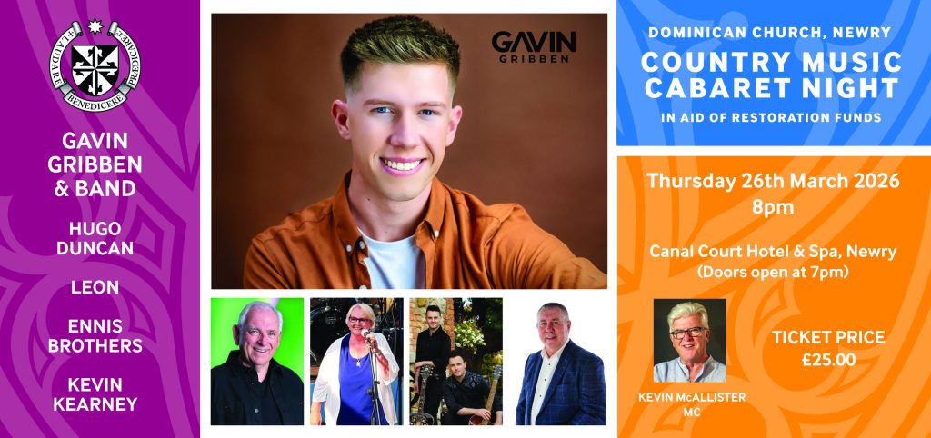 The Dominican Church Restoration Committee is delighted to announce a major Country Music Cabaret Evening in aid of the restoration of St Catherine’s Dominican Church, Newry. The event will take place on Thursday 26 March 2026 in the Miller Suite of the Canal Court Hotel, Newry, with doors opening at 7.00pm.